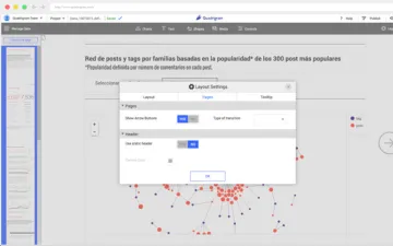 Su arquitectura es modular por lo que los usuarios solo deben ir añadiendo estos módulos en su proceso de creación. Uno de los puntos que hace de Quadrigram una herramienta atractiva es la posibilidad de crear visualizaciones interactivas, que se pueden integrar en cualquier Web, blog… El usuario final puede elegir variables, filtrar datos, conectar una visualización a otra, etc.